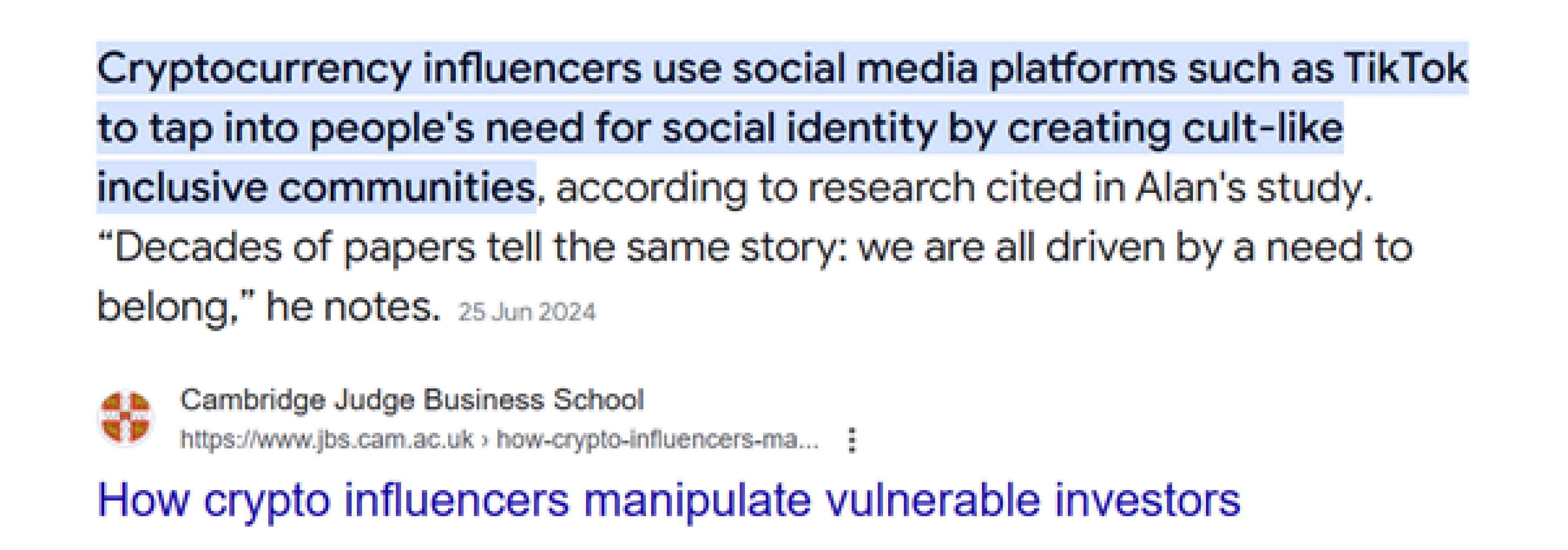 The first three search results for this query are ‘Research: Be cautious in following crypto-influencers’ from Indiana University, ‘How crypto influencers manipulate vulnerable investors’ from Cambridge Judge Business School and ‘You should be wary of crypto influencer advice’ from Futurity.