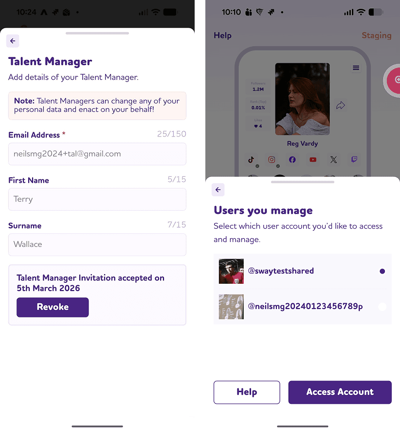 You can now add your Talent Manager’s details to your Sway Me Good account. This allows your Talent Manager to act on your behalf and apply for collaborations. They will also receive the same notifications as you. You can revoke their access at any time or update the details if you change managers.