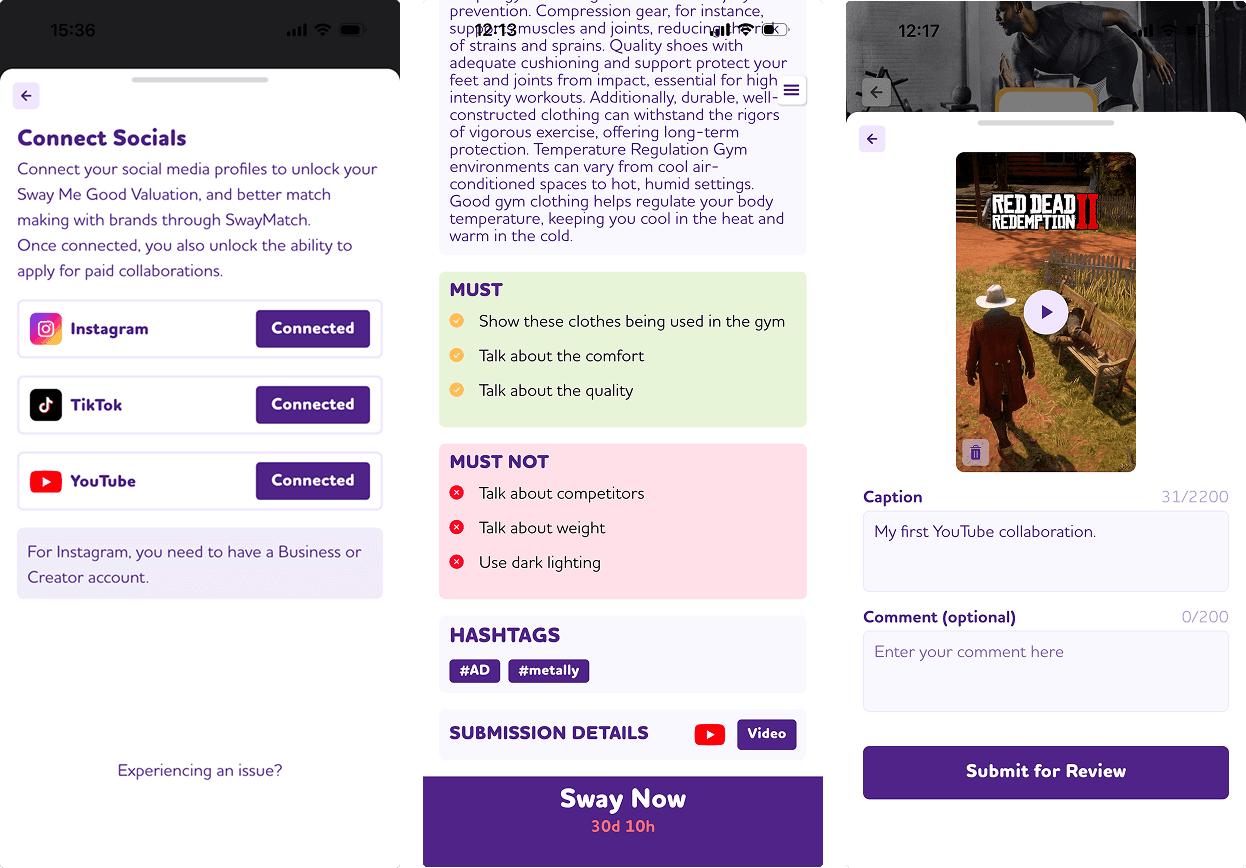SwayMatch AI analyses social handles you have added to your account, to rate how well you align to brands in terms of authenticity. Recommended brands will appear on the Featured tab and on each brand’s product page.
